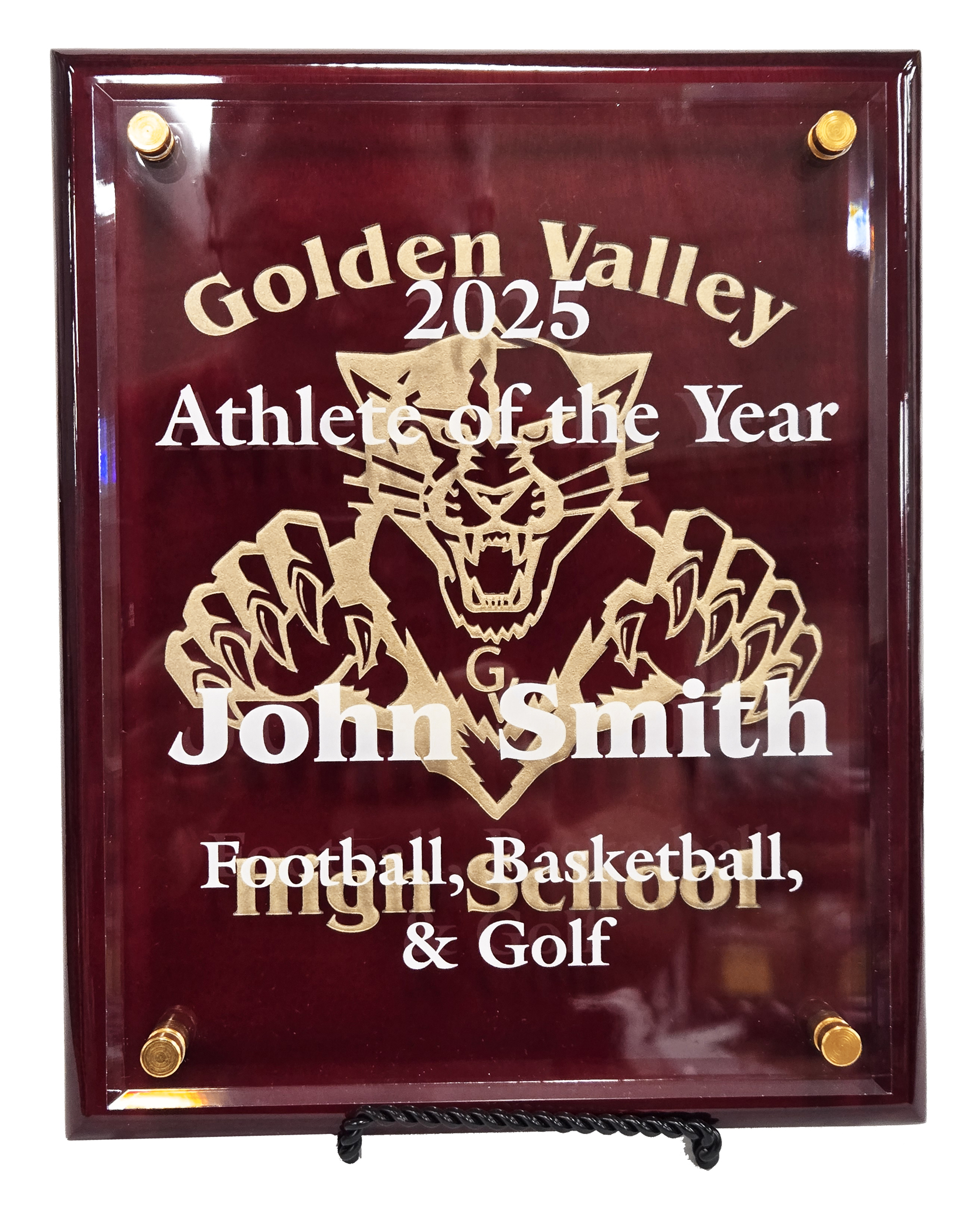 These are without doubt our most unique plaques. An acrylic panel is mounted to "float" away from the Rosewood Piano Wood plaque. We then use our direct color printer to print the plaque in a number of ways based on your requests. The logo can be printed on the plaque with the lettering on the acrylic for a 3D look, or the logo printed on the surface of the acrylic, with the lettering on the inside, or everything printed on the acrylic. You can also chose to just take your favorite family photo and create a piece of art for your fireplace mantle or book case. The plaque comes with angled rods that can be attached to the plaque so it free-stands without the need for a small display easel. You have design control.